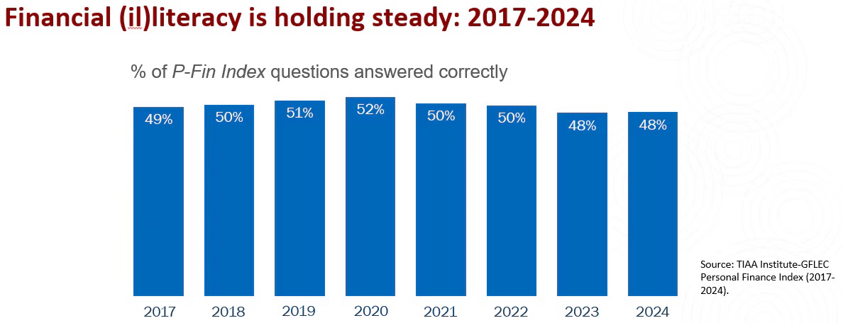 Financial literacy is crucial because we make decisions about money daily. Yet, data from the 2024 TIAA Institute-GFLEC Personal Finance Index (P-Fin Index) reveals how financial literacy in the US has hovered around 50% for eight consecutive years, with a 2% drop in the past two years, as show in this chart:1